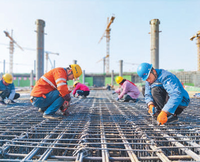 2月17日,在山东省菏泽市鲁南高铁菏泽东站施工现场,工人们正在作业。李保珠摄(影像中国)