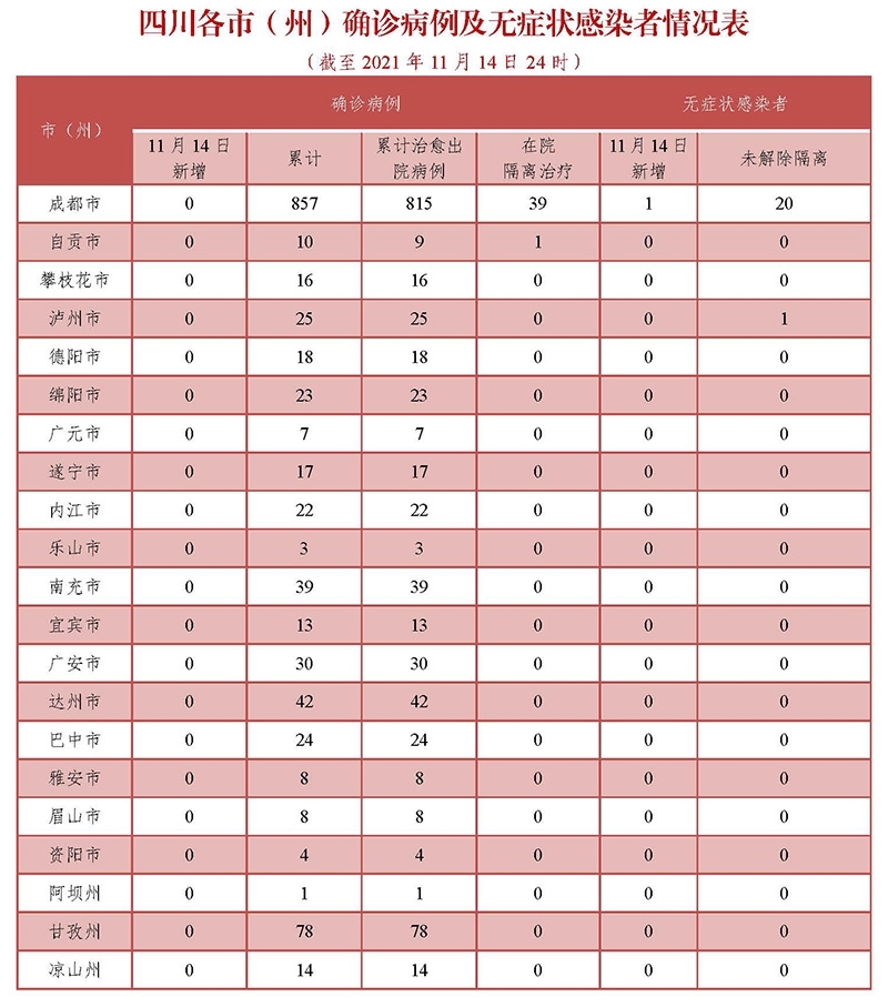 11月14日0-24时,四川无新增新型冠状病毒肺炎确诊病例,新增治愈出院病例2例,无新增疑似病例,无新增死亡病例。
