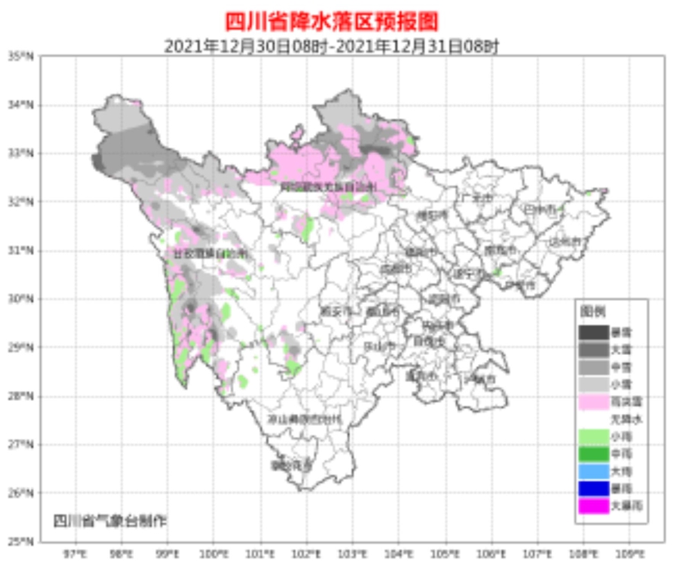 今天白天到晚上,盆地各市阴天间多云;阿坝州北部、甘孜州西部多云间阴天有阵雪(雨);川西高原其余地方和攀西地区多云。其中,阿坝州北部、甘孜州西部局部有中到大雪。