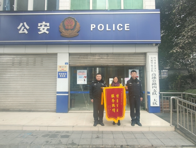 1月4日下午,宁夏回族自治区的金先生请人将一面写有“服务热情,情系百姓”字样的锦旗送到四川省高速交警四分局一大队民警手中,以表达对民警便民服务,热心援助的感激之情。