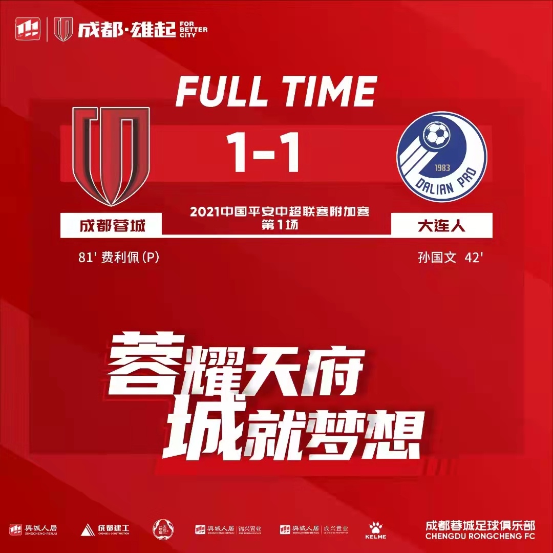 2021赛季中超中甲附加赛首回合比赛1月8日点燃战火。成都蓉城在先丢一球的情况下,凭借费利佩在下半场的点球,1:1战平中超大连人。由于双方首回合比赛战平,因此谁能进入下赛季中超,悬念还要留到双方次回合的较量。