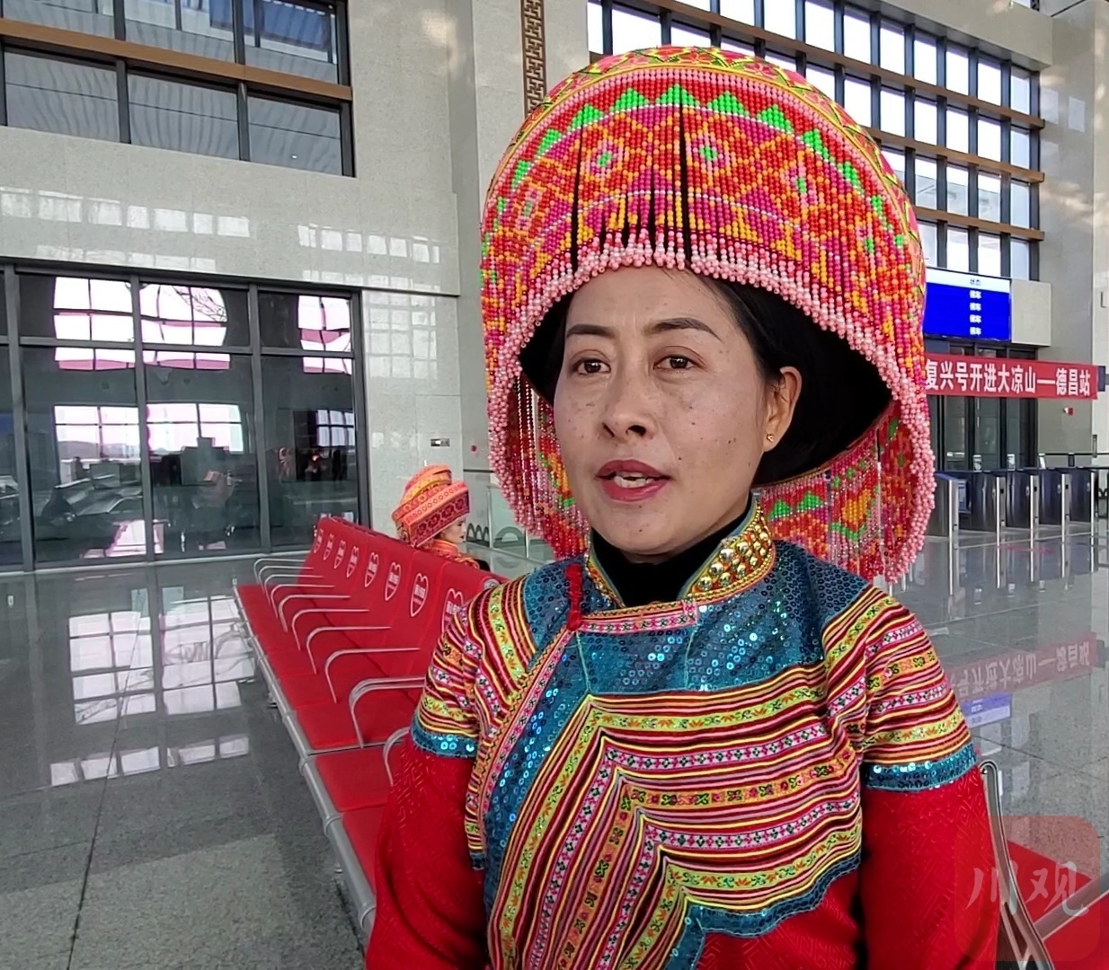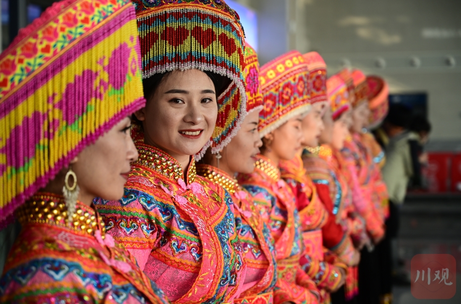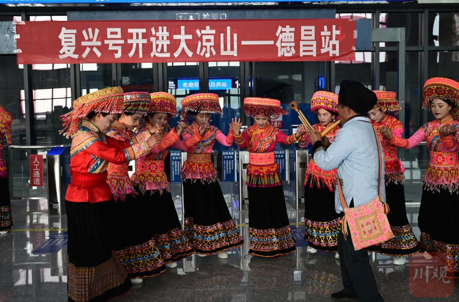 在德昌西站,一队傈僳族同胞身着华丽的民族服饰,载歌载舞迎接动车开进大凉山。熊丽是其中的一员。