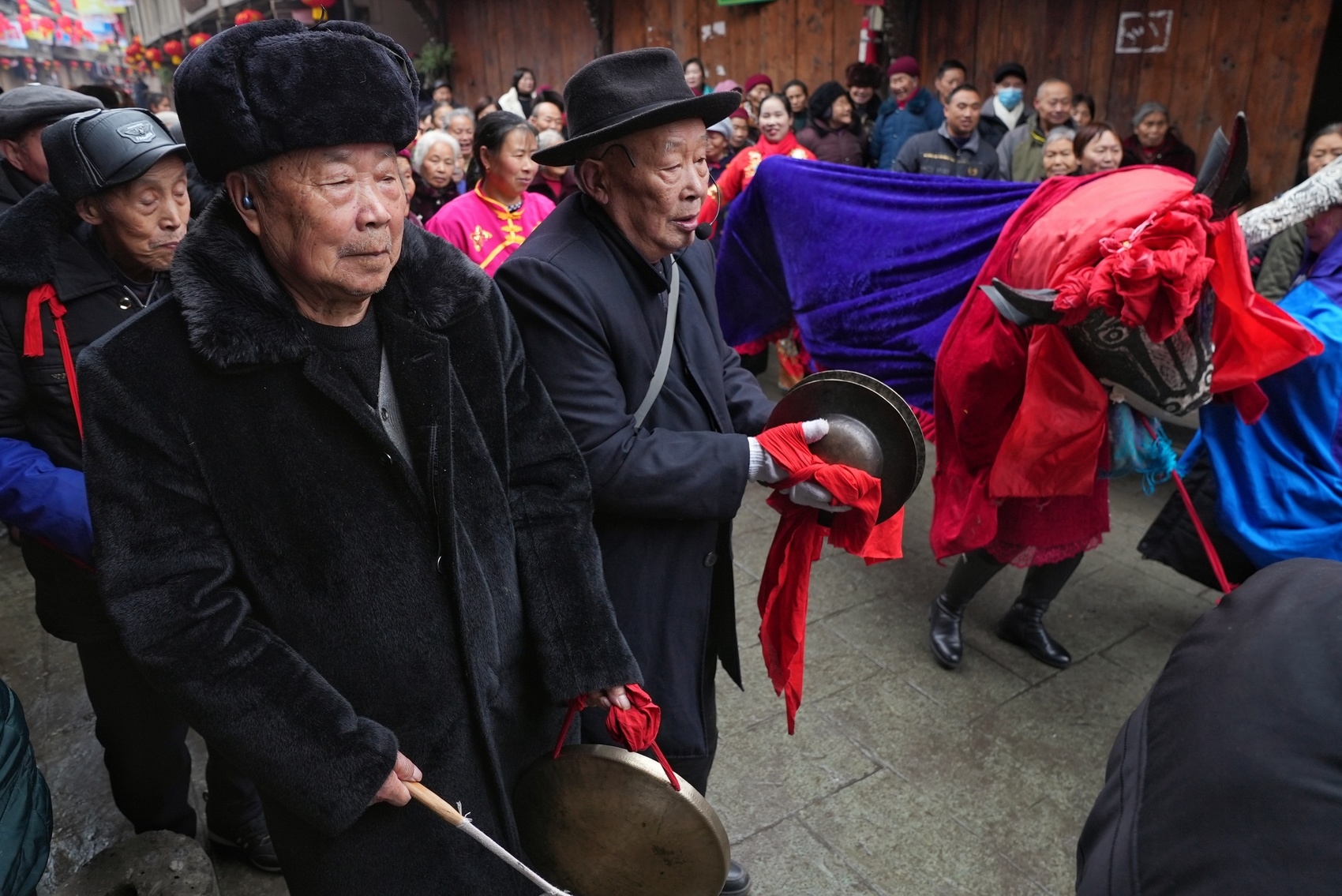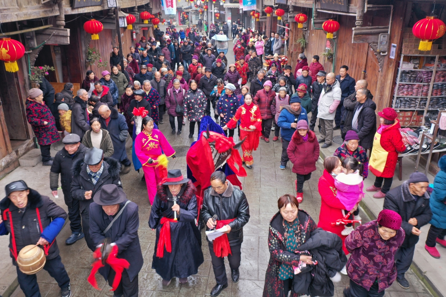早上10时许,“牛儿灯”队伍沿着张灯结彩的大同古镇老街载歌载舞,锣鼓喧天,唱腔悠远,“牛倌”与“耕牛”装扮生动、娴熟诙谐,吸引了游客和居民观看、拍照,邛崃大同“牛儿灯”也成为了牛年末尾的人文与氛围担当。