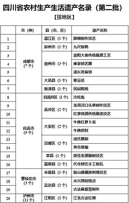 1月11日,四川省农业农村厅发布了四川省第二批农村生产生活遗产名录,温江酥糖制作技艺、大邑荤豆花、自流井冷吃兔等145个项目入选。