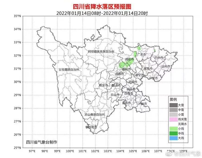 四川天气预报:今天白天,盆地各市阴天间多云,其中广元、绵阳、德阳、巴中、达州、南充、广安、遂宁、资阳、自贡10市和宜宾、泸州2市南部早晚有小雨或零星小雨,盆周高海拔地区有雨夹雪;甘孜州中东部、阿坝州东部南部和凉山州东北部多云间阴天有阵雪(雨);川西高原和攀西地区其余地方多云间晴。昨晚至今天白天24小时内,盆地最低气温:4~7℃;最高气温:9~11℃。