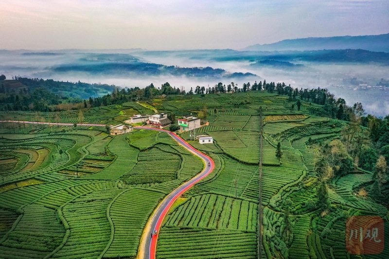 1月14日清晨,走进雅安雨城区草坝镇徐坪村,严冬时节的茶园仍是碧绿苍翠,站在红黑相间的崭新茶园骑游道旁眺望,周边云雾缭绕,山下的村镇、树林、茶园等“仙气”飘飘、若隐若现,宛如置身仙境。