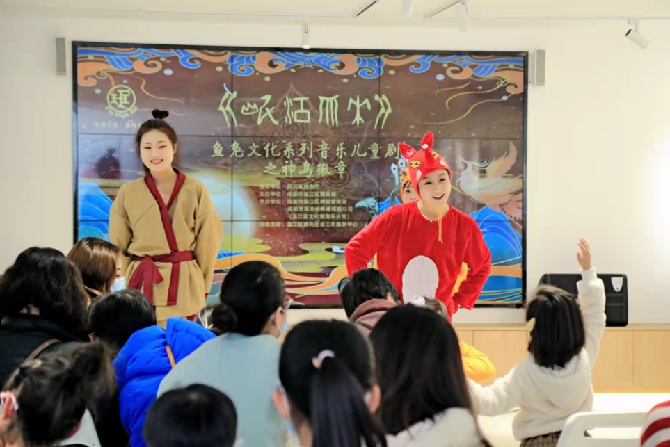 新年伊始,1月15日下午,《岷江而来》——首部鱼凫系列儿童剧在成都温江开演。儿童剧结合四川林盘的绿色生态,生动展现了古蜀国鱼凫文化特色元素:鱼凫王国、太阳神鸟。将这些本土特色元素润物细无声的将传统文化发扬光大。