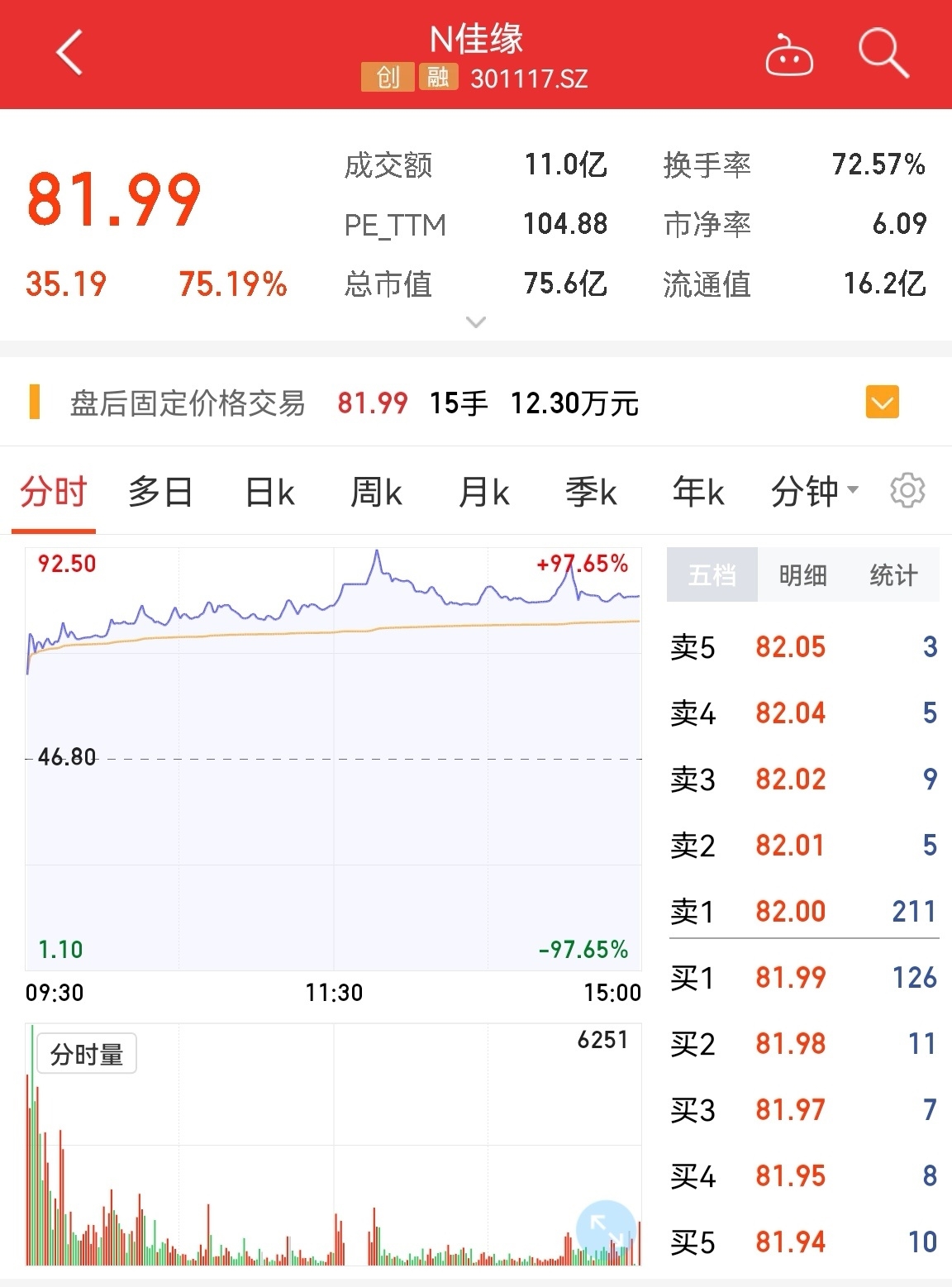 作为今年的四川A股“第一股”,佳缘科技发行价格为46.8元/股。今日开盘股价大涨38.89%,报65.00元/股。盘中,每股股价一度暴涨至92.5元,最高涨幅达到97.65%。截至收盘,佳缘科技股价有所回落,报81.99元/股,涨75.19%。