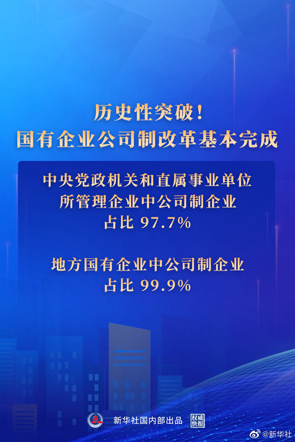 国务院国有企业改革领导小组办公室副主任、国务院国资委副主任翁杰明1月17日表示,截至2021年年底,我国国有企业公司制改革基本完成,中央党政机关和直属事业单位所管理企业中公司制企业占比97.7%,地方国有企业中公司制企业占比99.9%,实现了历史性突破。(记者王希,海报设计杨轶群)