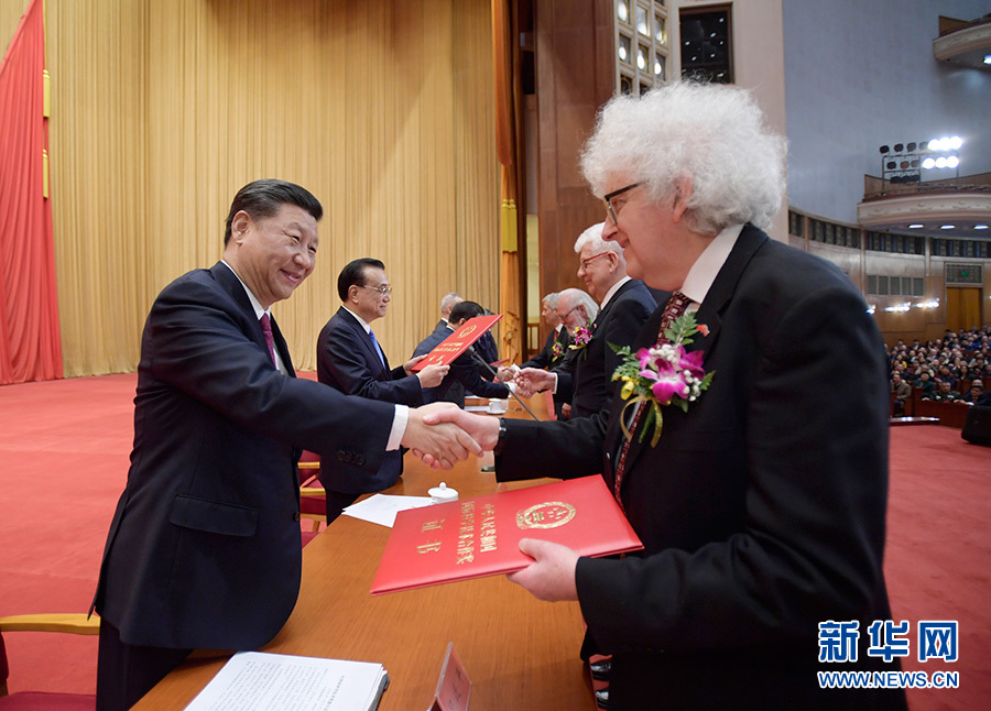 1月10日,2019年度国家科学技术奖励大会在北京人民大会堂隆重举行。这是中共中央总书记、国家主席、中央军委主席习近平向获奖代表颁发证书。 新华社发(盛佳鹏 摄)
