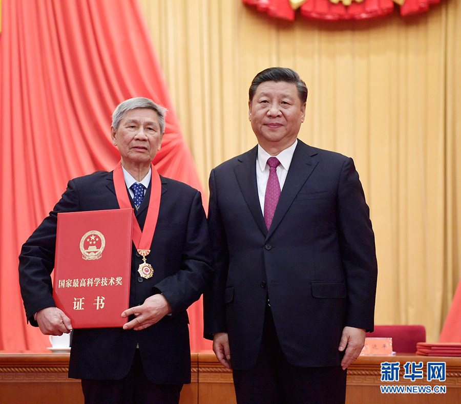 1月10日,2019年度国家科学技术奖励大会在北京人民大会堂隆重举行。中共中央总书记、国家主席、中央军委主席习近平向获得2019年度国家最高科学技术奖的原中国船舶重工集团公司第七一九研究所黄旭华院士颁奖。 新华社记者 李学仁 摄