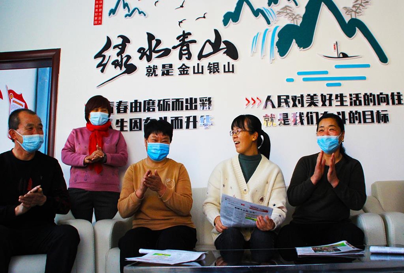 ▲新疆塔城地区裕民县新地乡新地西村村“两委”干部、驻村工作队队员和村中老党员一起学习党的十九届六中全会精神。
