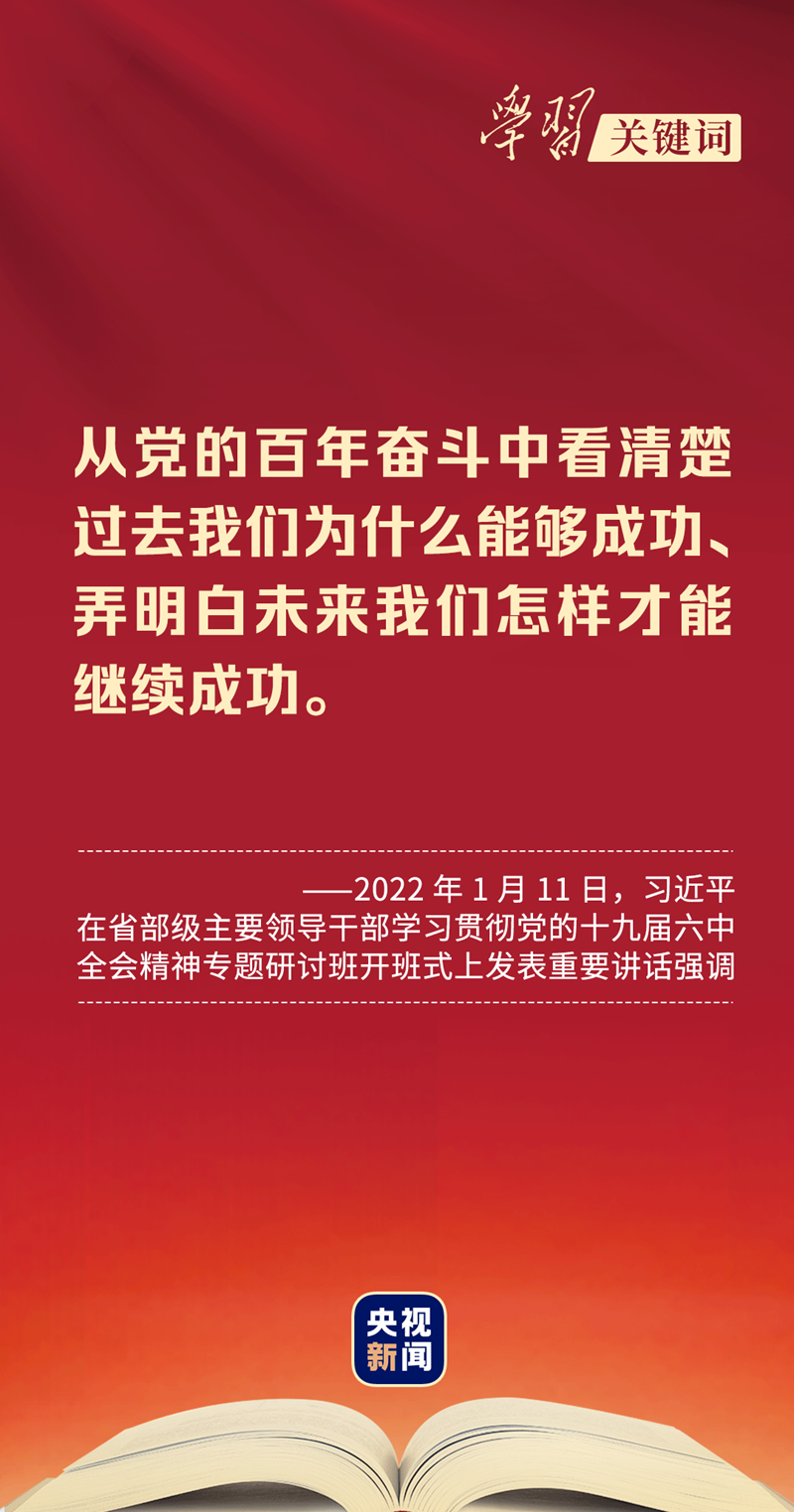 “从党的百年奋斗中看清楚过去我们为什么能够成功、弄明白未来我们怎样才能继续成功,从而更加坚定、更加自觉地践行初心使命,在新时代更好坚持和发展中国特色社会主义。”
