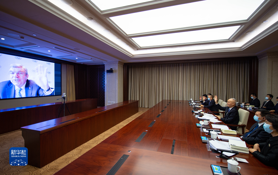 近日,中共中央政治局委员、北京市委书记、北京冬奥组委主席蔡奇视频会见了国际奥委会主席托马斯·巴赫。这是视频会见现场(1月15日摄)。新华社记者 陈钟昊 摄
