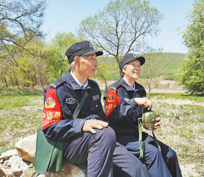 韩淑秀(右)和薛奎在巡边路上休息。 |