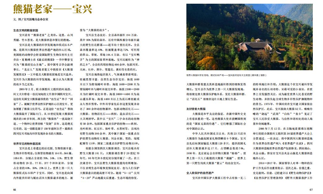 宝兴在中国保护大熊猫工程中占有独一无二的特殊地位和作用。大熊猫这个在宝兴被科学发现并命名的长相奇特、呆萌可爱的小家伙,在世界上引发强烈关注,成为最受世界人民喜爱的野生动物,并担负起全球生物多样性保护旗舰物种的责任。1975 年,中国政府在宝兴建立国家级自然保护区,此后,宝兴救助大熊猫52只,嗷嗷待哺的“硗远”“武岗”“白杨”“张卡”见证了宝兴人民珍爱大熊猫、与自然和谐相处的动人场景和奇闻趣事。
