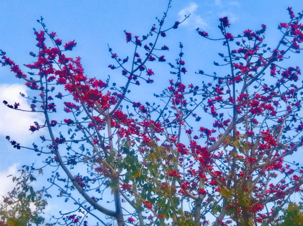 我们来到攀枝花市区时,英雄花的花期已经到来。大片大片鲜红的花朵与蓝天白云构成一组令人陶醉的“舞台布景”,将这座英雄城市烘托得蔚为壮观。难怪古人用“浓须大面好英雄,壮气高冠何落落”来赞美攀枝花。