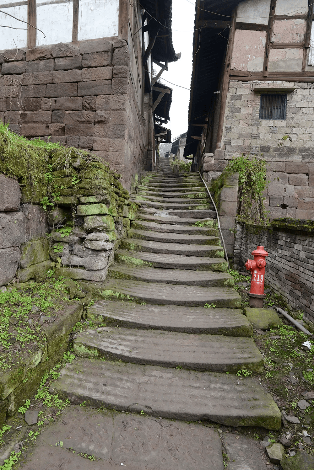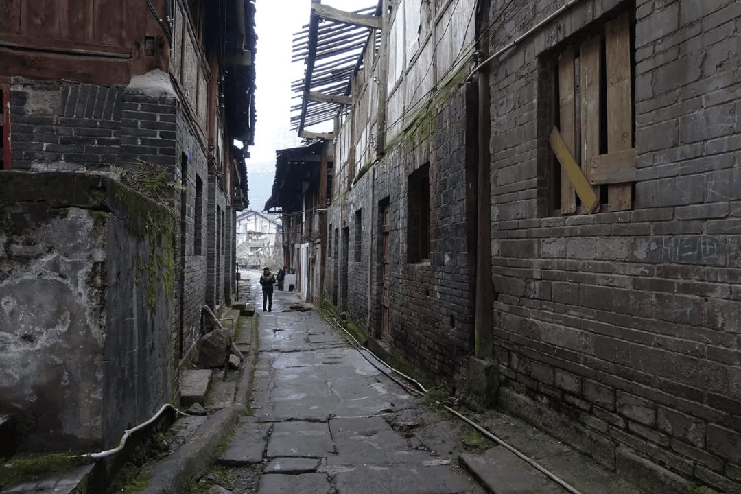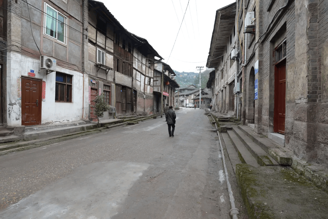 场镇上保留下来的老街道有解放街(铁铺街)、胜利街、民主街(石家湾街)、半边街和锅市街等。胜利街很短,在靠山的最高处,沿陡长的石台阶可走到山梁后。整齐的青石板铺设、约三米宽的半边街,古旧地道。小街临山,街两边都是带有石础、石阶的穿木式传统木构建筑体,建筑临街面多设计为商铺式样,门面高、开间阔。建筑以两层为多,风貌样式近似,其中一些房屋破败,露出高大的古砖墙体和巨石建构,其早年的富丽堂皇让人触目兴叹。半边街一头沿石梯可直通江边码头,另一头与解放街相连。古朴、宁静,走在半边街中让人恍若有回到古时的感觉,遐想连连。解放街是场上较为热闹的街,该街向场中横向延伸的一段为锅市街。锅市街两边多为20世纪上半叶先后建造的连排楼房,据称这些楼房多为旧时县属各部门的公房。这些临街楼房也极具看点,建筑样式和建筑材料具有时代特点外,还能在其中建筑外立面上看到一些旧时的标语口号。