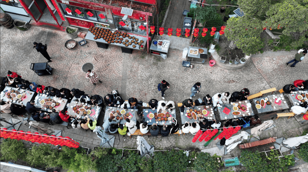 走进农家小院,露天的坝子里整齐地摆满了桌椅,红色的桌布在阳光下明艳动人,与周边翠绿的田园风光相互映衬,别有一番韵味。忙碌的身影穿梭其中,妇女们在临时搭建的灶台前熟练地翻炒着菜肴,袅袅炊烟携带着诱人的香气弥漫开来,令人馋涎欲滴;男人们则忙着搬运桌椅、仔细摆放餐具。