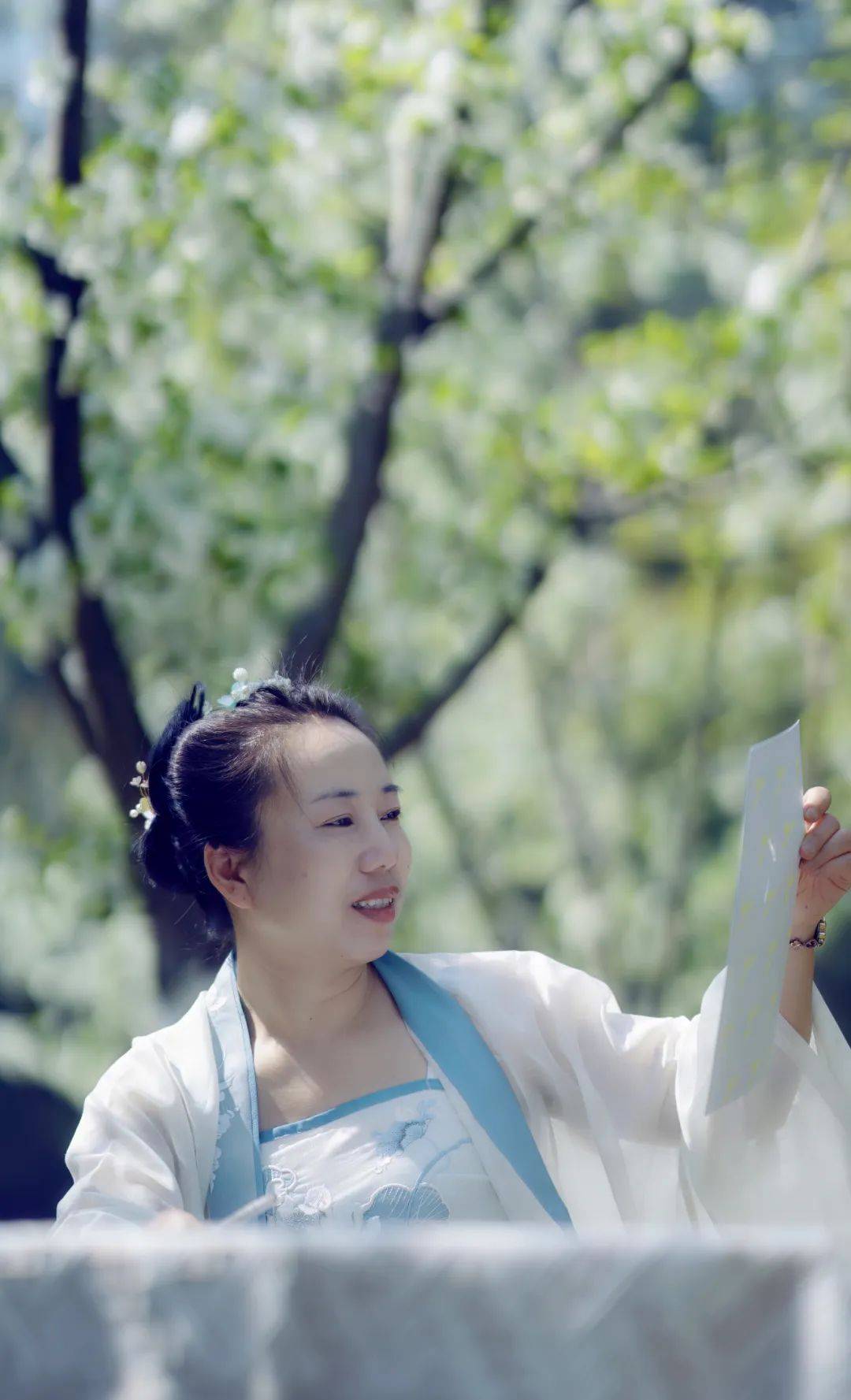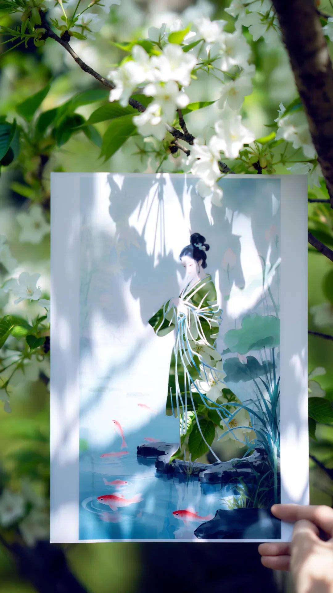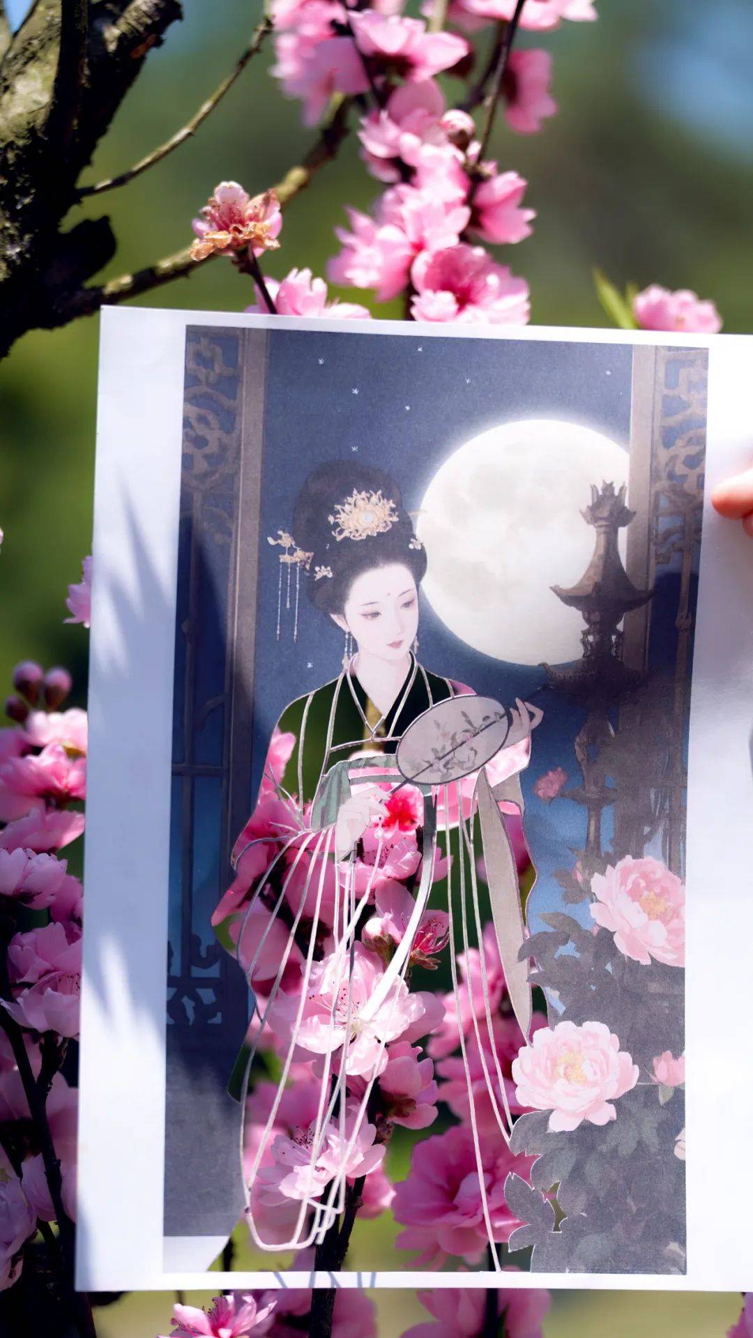 这是一场现代与古代的“对话”,游琴舒特别重视,她穿上汉服,化上精致的妆容,带上剪刀、刻刀、AI绘制好的美人图案,自驾来到广都博物馆、永安湖森林公园等地,或站或坐在花海里,用春风与春花呼唤美人,用刀与纸剪出美人们的绝代风华。