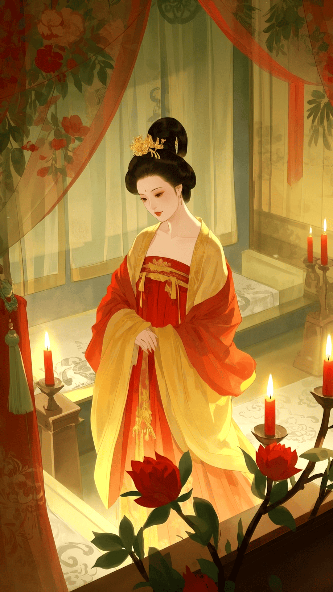 虞美人染透荔枝红裙,浸着杨贵妃最爱的岭南荔枝汁——那抹红,是快马踏碎官道晨露时溅起的朝霞,是杜牧笔下“一骑红尘妃子笑”时唇角的胭脂,更是马嵬坡三尺白绫也掩不住的大唐绝色。