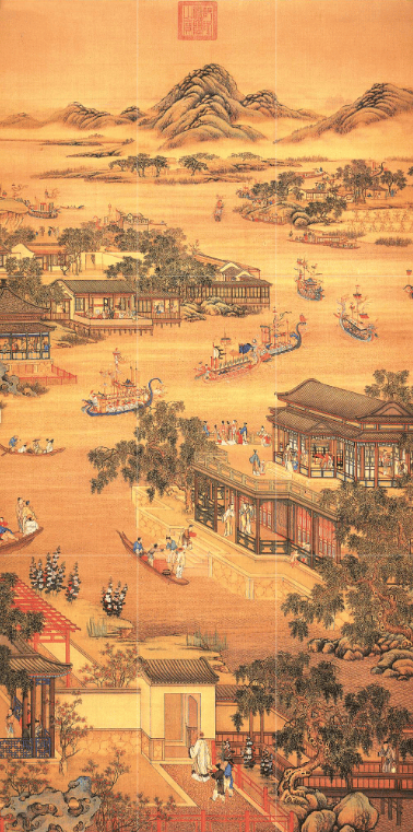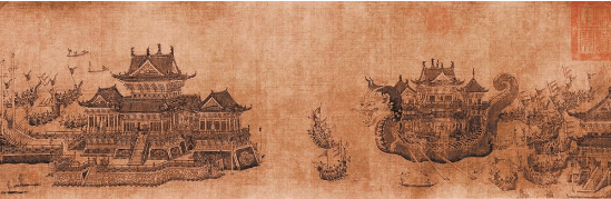 《金明池争标图》传为北宋画家张择端所绘,描绘了宋代皇家园林金明池里龙舟争标的激烈、紧张气氛。