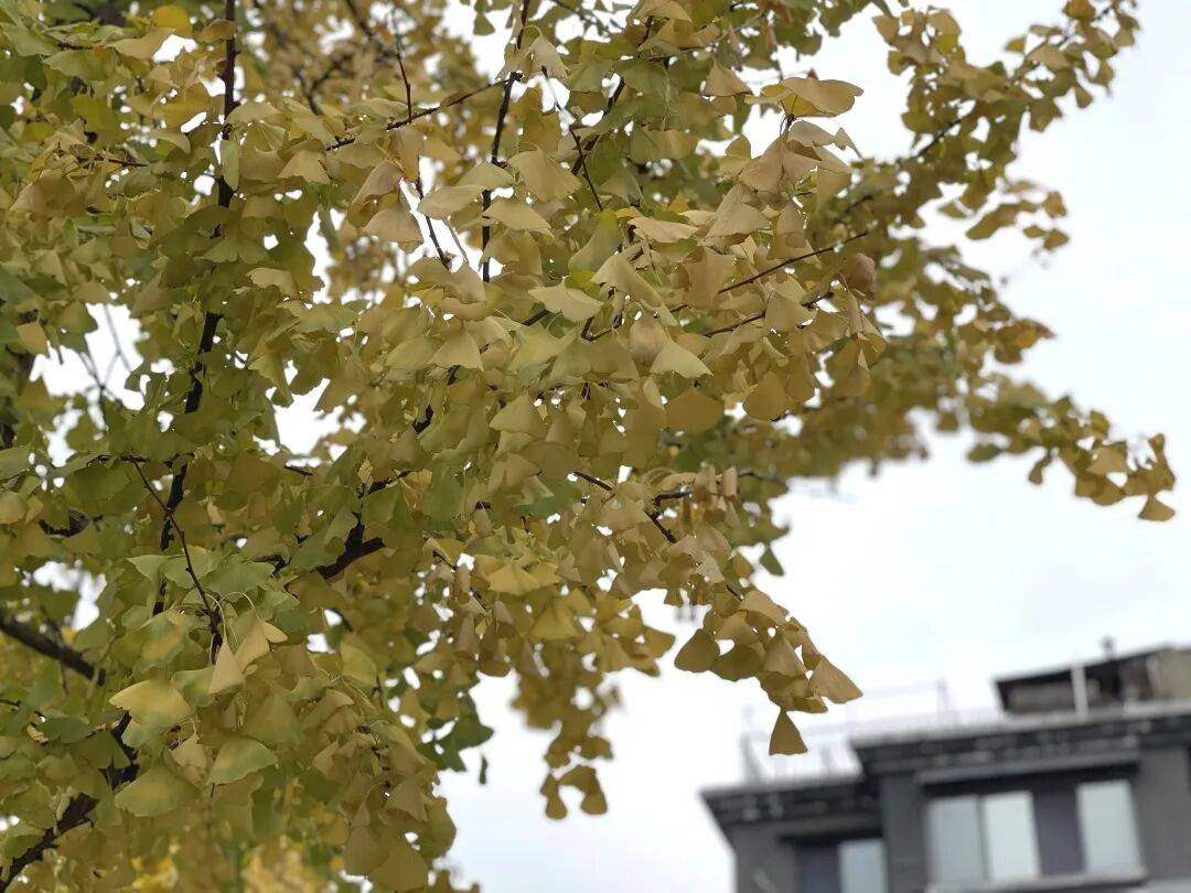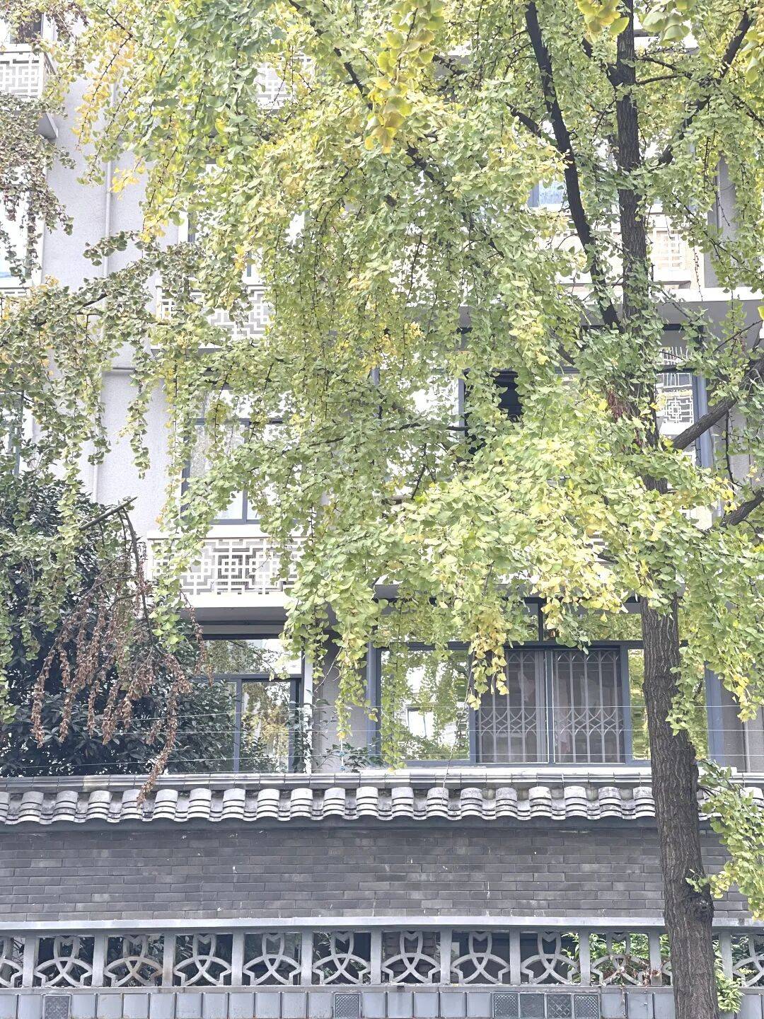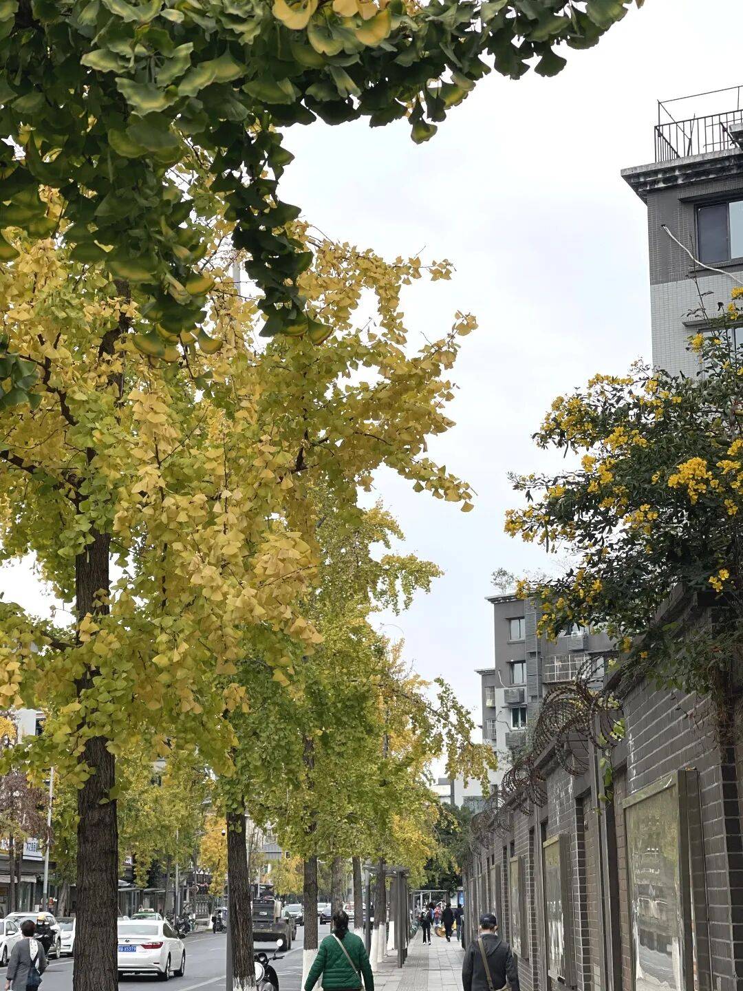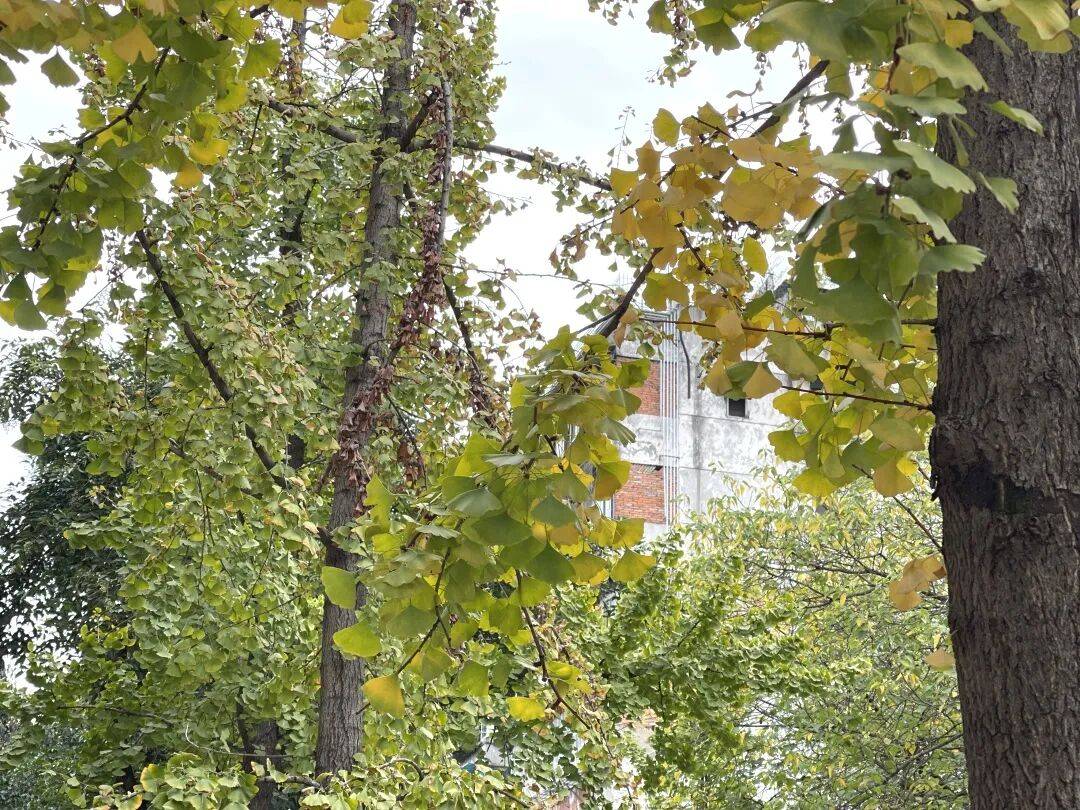 银杏树上青黄叶,小区楼旁灰白墙。冬日之下,闹市之中,漫步在银杏覆盖的街道上,仿佛能从压抑的气氛中解脱出来,享受片刻的悠闲。