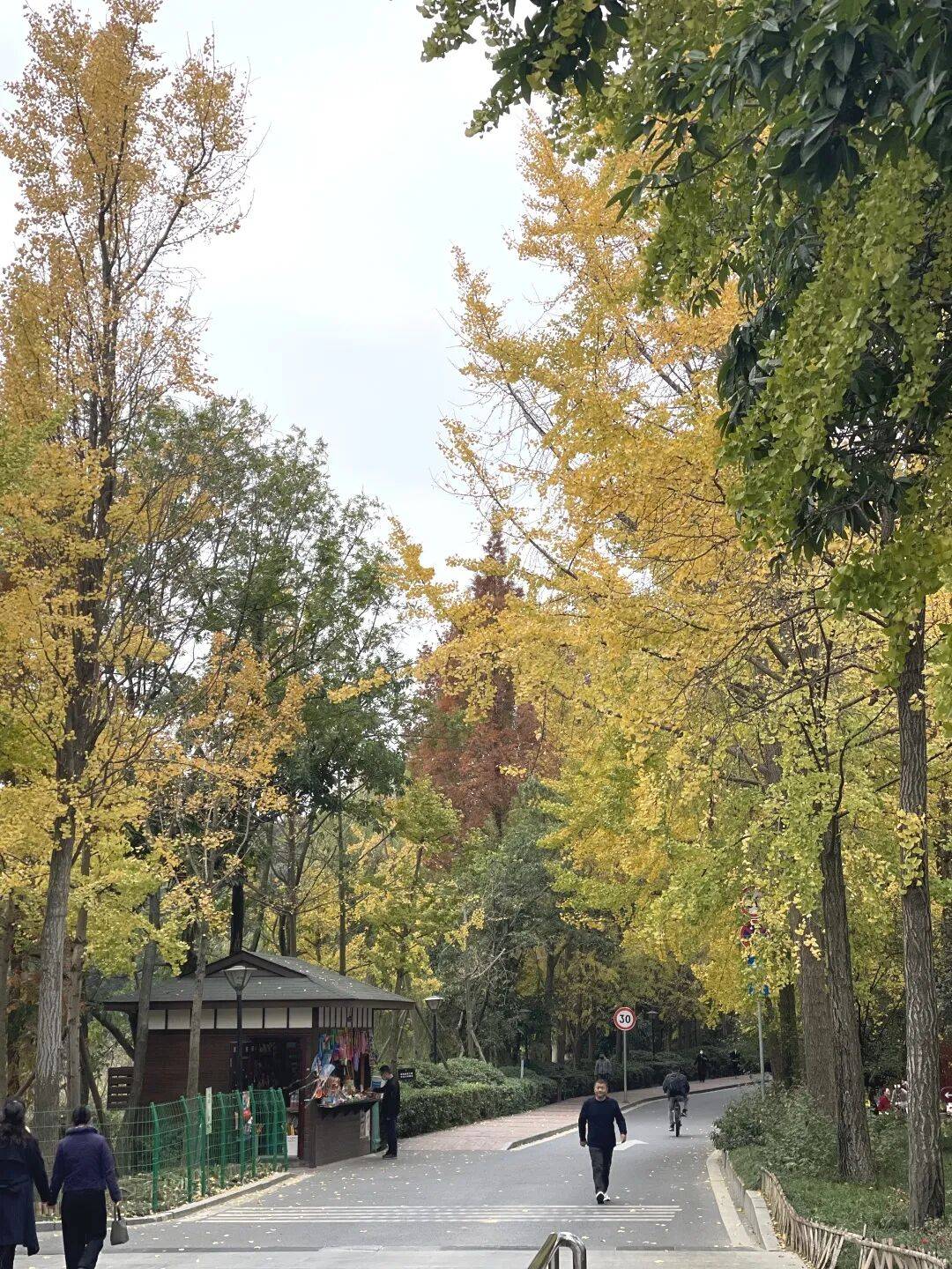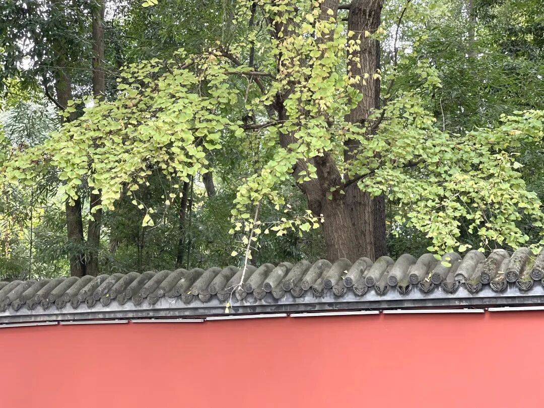 银杏树在这里是独特而不容忽视的。在冬季冰冷的氛围下,连草木都散发着幽深的气息。只见公园内树木丛生,青处青得发乌,黄处黄得亮眼。这一冷一暖对比,竟无丝毫违和之感,也绝无半点对抗之意,像是春夏与秋冬达成了和解,在此安然共存。而银杏正是这里金黄色的主角,虽然叶片仍是绿黄相间,但金黄的色调早已占据了主导,牢牢地抓住了游人们的目光。红墙灰瓦之间,亦能窥见青黄。