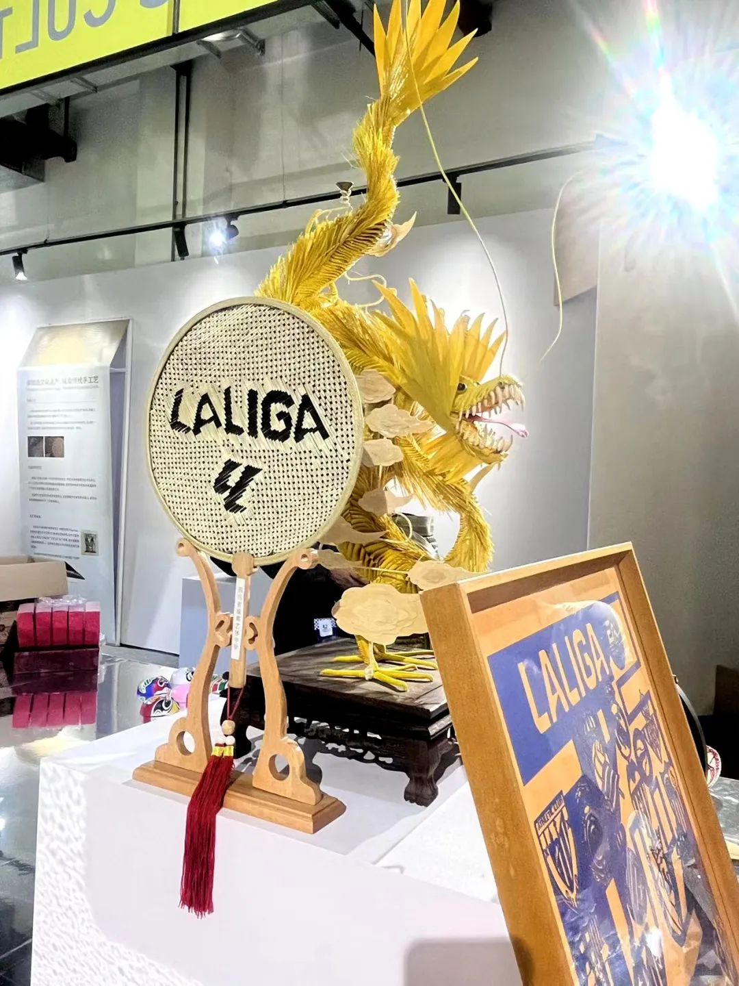 这些作品中,国际范儿竹扇“出圈”:以西班牙足球联赛标志“LALIGA”为主题的圆形竹编扇,因其跨界创意吸引众多年轻观众拍照打卡。一位球迷赞叹:“竹编的字母线条竟能如此流畅,传统工艺也能‘玩转’国际符号!”