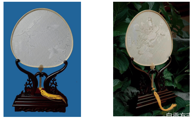 第四代传承人龚道勇创作的龚扇作品 (左)和 第五代传承人龚瑶妤创作的龚扇作品(右)