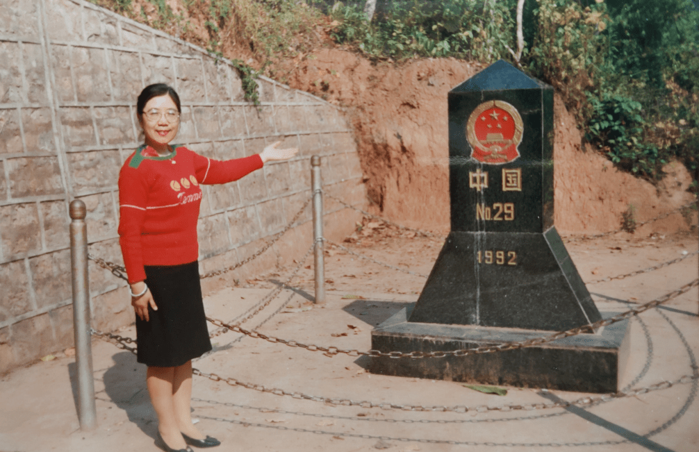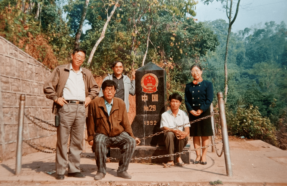 1994年,本文作者蔡玲(右一)与中国云南国际经济技术合作公司副总(左一)、外经贸部合作司亚洲处干部刘明哲(左二)、驾驶员老李(左三),副总秘书(右二)在中国与老挝交界的界桩前留影