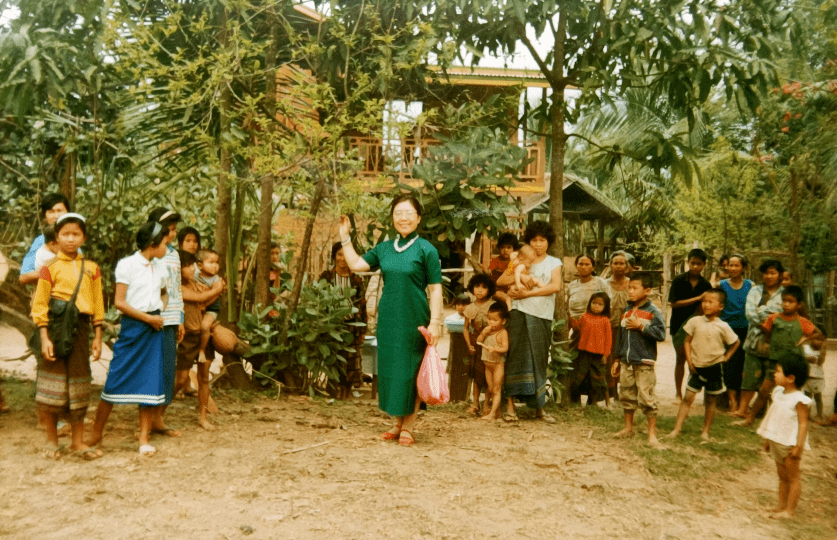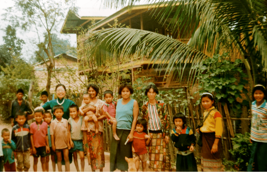 1994年,本文作者蔡玲在考察点与老挝村民合影。木质与竹质的阁楼上层住人,下层堆放劳动工具及杂物,无门,无人偷窃。老挝是世界上最不发达的国家之一,国民贫困