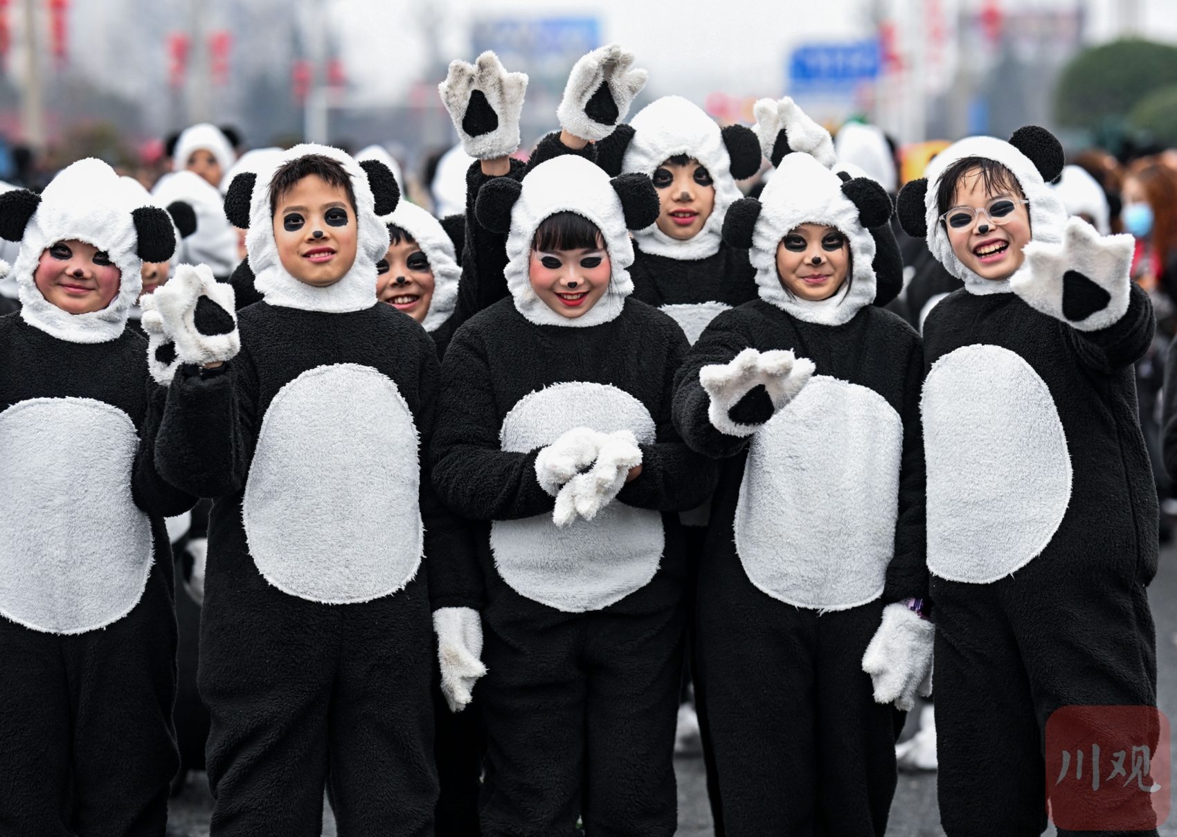身着熊猫服的小朋友加入巡游队伍