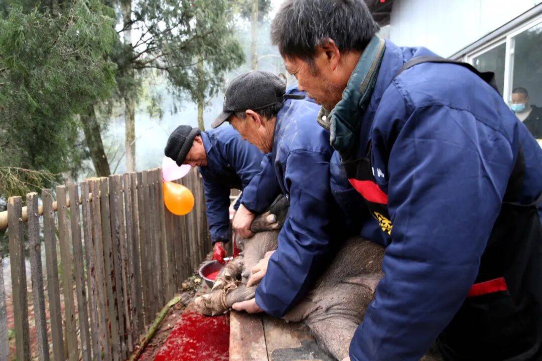 按我们灌县麻溪(今都江堰市麻溪乡)的风俗,杀年猪若是猪血喷薄,来年一家人定能平安顺遂;若是猪血能围着盆边滴成圆圈,便认为日子会过得更加圆满。