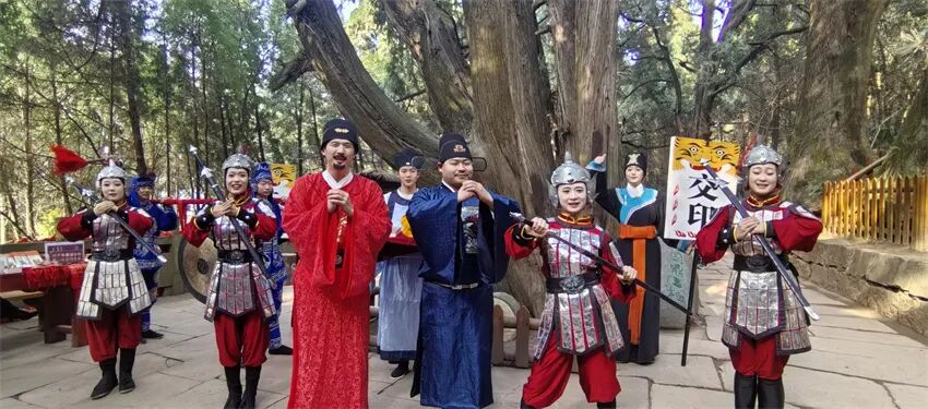绿色长廊上,一阵锣鼓声引起了游客的注意——身着明代官服的“离任知州”与“接任官员”,穿行于古柏林间,清点交接“官树”,再现“点树交印”的古道盛典。