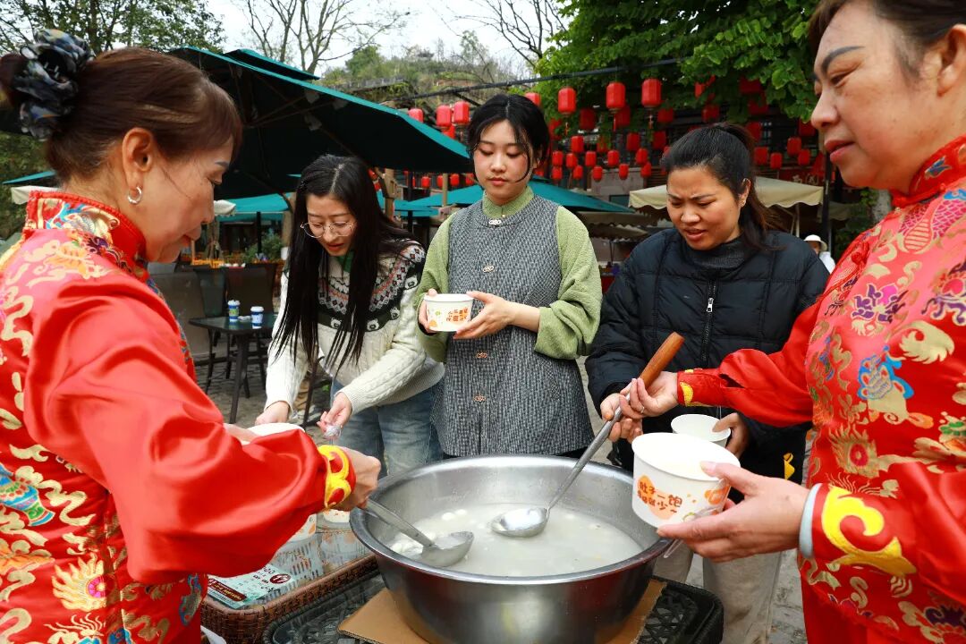 紧接着,赞礼官带领大家巡游古镇。古街小巷人潮涌动,汤圆铺子热气腾腾,芝麻的馅香与喜糖香甜交织,五凤溪用一场盛大的唐朝婚礼,唤醒了古镇的千年记忆,也用最传统的民俗巡游,让“我们的节日·元宵”在每个人的记忆中,留下了一抹鲜亮的中国红。