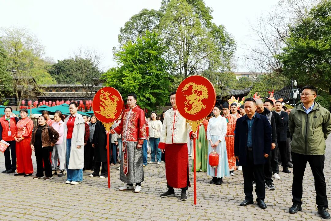 上午十时,南华宫古戏台前已聚满慕名而来的市民和游客。伴随着古筝合奏的《破阵乐》旋律,成都金堂五凤溪“古韵新 情暖五凤”唐代婚俗集体婚礼”正式拉开帷幕。