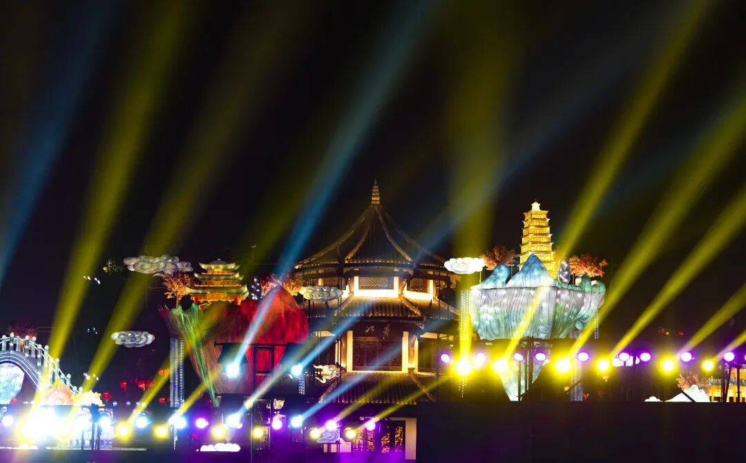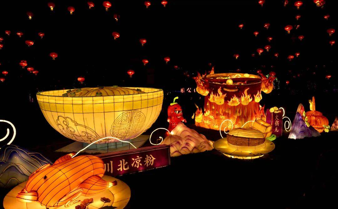 五彩斑斓的灯笼挂满枝头,将夜色点缀得如诗如画,仿佛一匹流光溢彩的锦缎在夜空中舒展。
