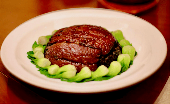 食用前,用原汤加味精、香菜等调味品,勾薄芡浇在肘子上。此时,肘子红得透亮,色如玛瑙。空气中散发出冬菜的幽幽香气,夹起一块尝尝,软而不烂,肥而不腻,让人欲罢不能。