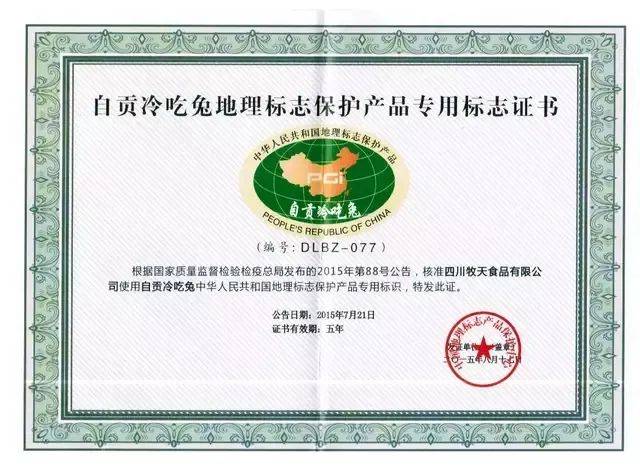 改革开放以来,自贡有识之士把传统工艺与现代食品加工生产工艺相结合,经过长期的实践探索和经验积累,选用地方特色明显的肉兔和世界千米深井盐以及特有的辣椒、花椒为主要原料,按最佳比例配方和科学的工艺规程组织生产,将自贡冷吃兔这道传统美味菜肴发展成了一个蕴含盐都饮食文化元素的地方特色食品。2014年2月,“自贡冷吃兔”正式获批为“国家地理标志保护产品”。2015年,四川牧天食品有限公司获准使用“自贡冷吃兔”国家地理标志保护产品专用标志进行生产。
