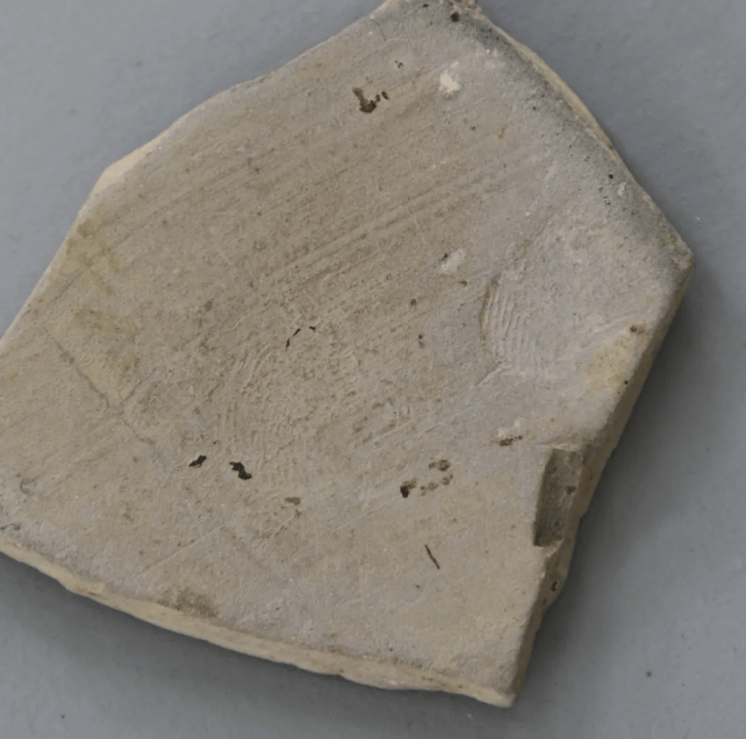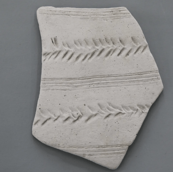 成都市文物考古研究院在宝墩古城遗址发掘出带手指纹与稻穗纹的陶片( 图片来源:成都市文物考古研究院)
