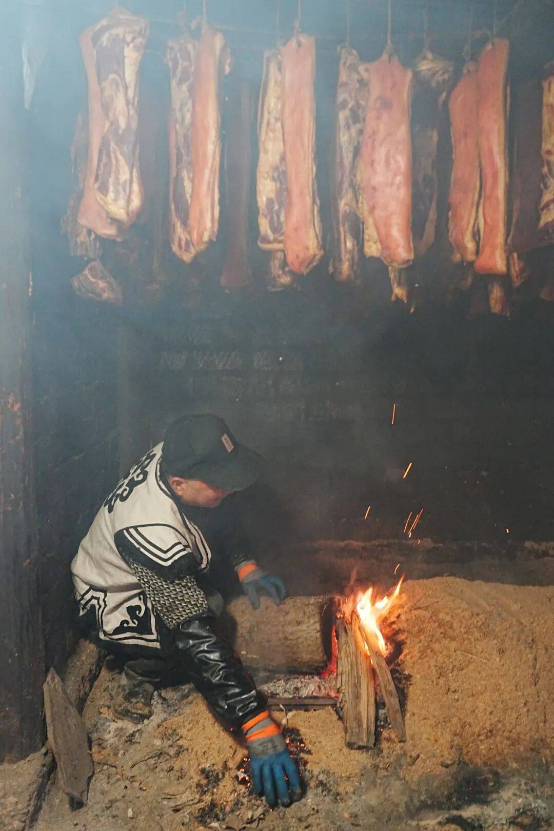 晾晒好的肉,便被请进那座百年石板房炕坊。炕坊中央,是那个见证岁月的火塘。燃料极为讲究,多用从山里溪流中捡拾的“水捞柴”——这些被雪水浸泡、又被山洪冲刷下来的木材,自带一股干净的清香,也有香椿木、香樟木等果木。