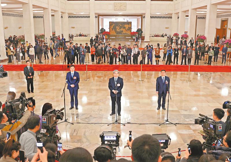 3月4日,全国政协十四届三次会议首场“委员通道”集体采访活动在北京人民大会堂举行。 新华社记者 张玉薇 摄