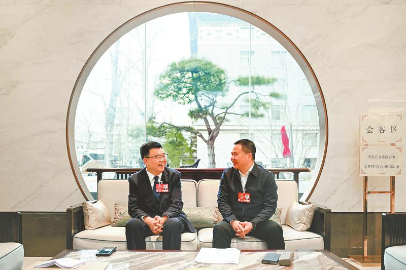 川渝一家亲,如何唱好“双城记”?3月3日,出席全国政协十四届三次会议的四川省全国政协委员李正国(右)与重庆市全国政协委员董洪川在交流。 四川日报全媒体记者 杨树 摄