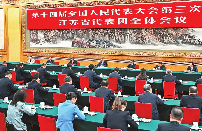 三月五日下午,中共中央总书记、国家主席、中央军委主席习近平参加他所在的十四届全国人大三次会议江苏代表团审议。新华社记者燕雁摄