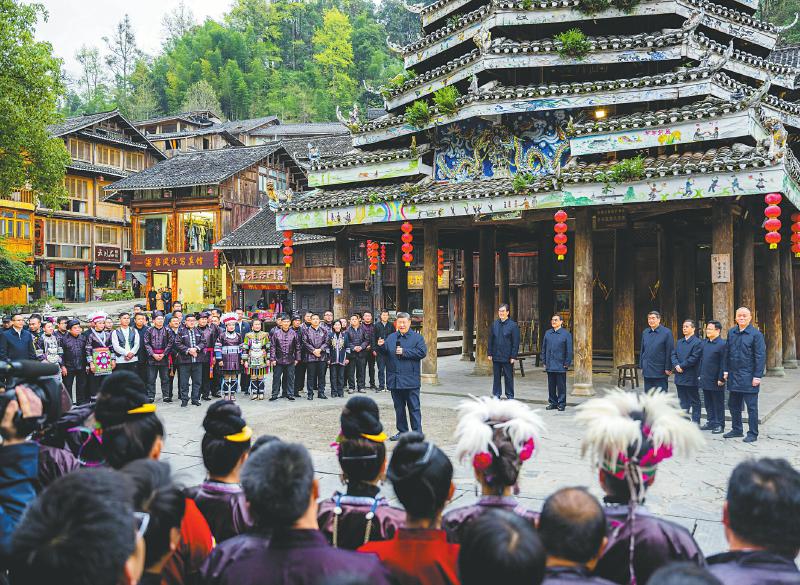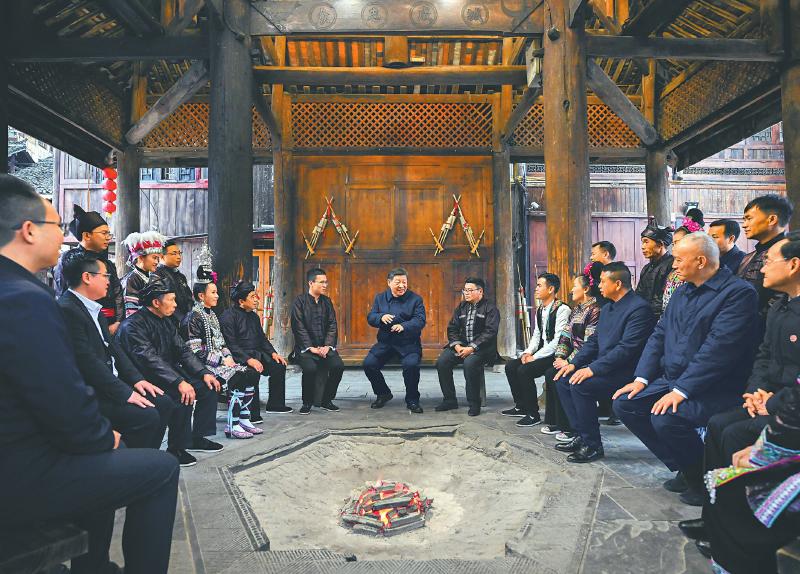3月17日至18日,中共中央总书记、国家主席、中央军委主席习近平在贵州考察。这是17日下午,习近平在黔东南州黎平县肇兴侗寨考察时,同村民们亲切交流。 新华社记者 翟健岚 摄