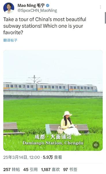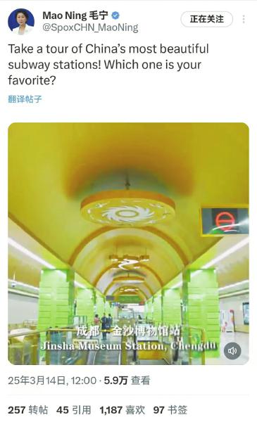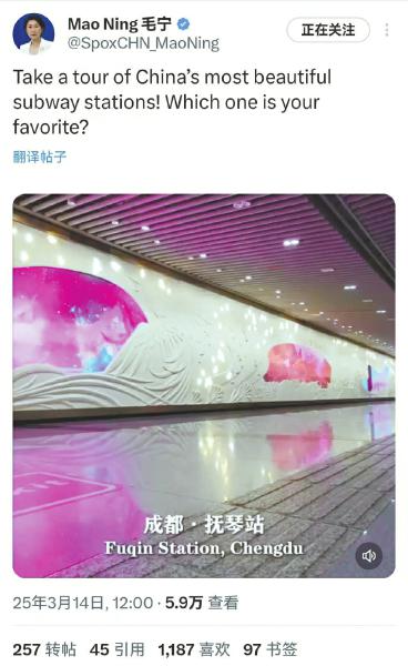 外交部发言人毛宁点赞成都地铁站页面截图。成都轨道集团供图