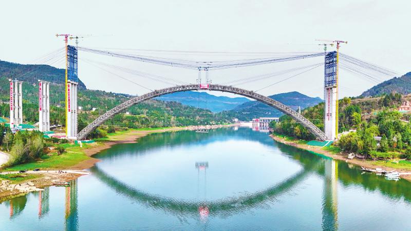 近日,镇广高速公路通广段控制性工程云台通江河特大桥的主拱劲性骨架顺利合龙,为后续施工奠定基础,意味着该路段距离建成通车又近一步。 张书浩 摄