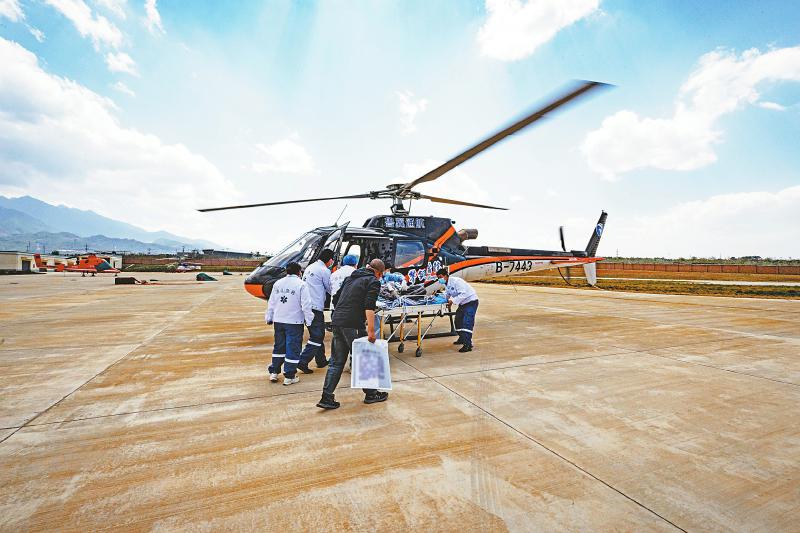 4月6日中午,凉山州盐源县人民医院一例危重病人,通过航空医疗救援转运至攀枝花市攀钢集团总医院救治。这是盐源县与攀钢集团总医院签订航空医疗应急救援合作协议后的首例患者转运。 曹正林 摄(C视觉)