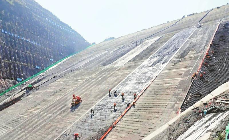 李家岩水库正在开展大坝混凝土面板浇筑作业。 受访者供图